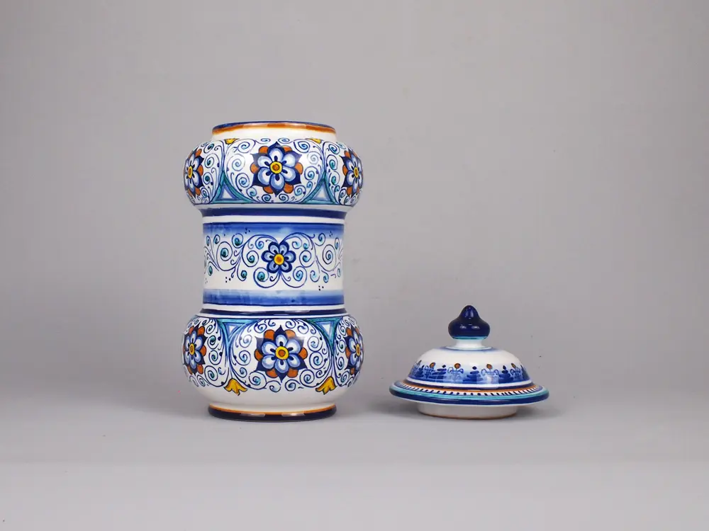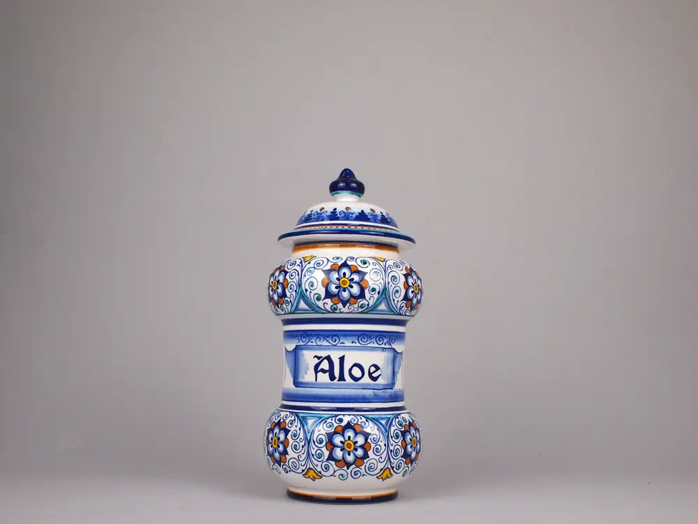 CategoryAlbarello-shaped ceramic vase with rounded bellies. This so-called apothecary jar is hand-decorated in the traditional ‘Rosette’ style (a variant of the Persian Palmetta style) with the inscription “Aloe” inserted in the scroll.