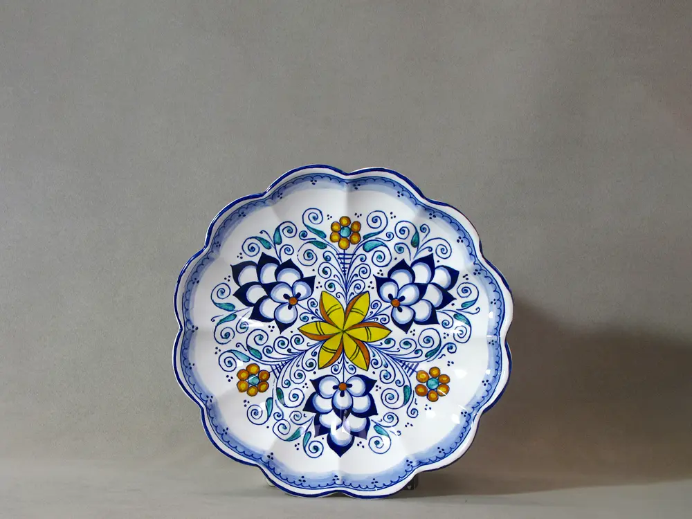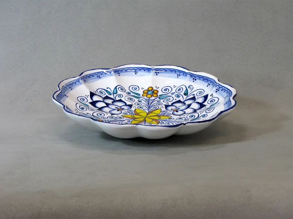 CategoryCenterpiece bowl in Faenza ceramic with the typical “crespina” shape, hand-decorated with three Persian Palmettes, three Rosettes and a geometric flower in shades of yellow in the centre.