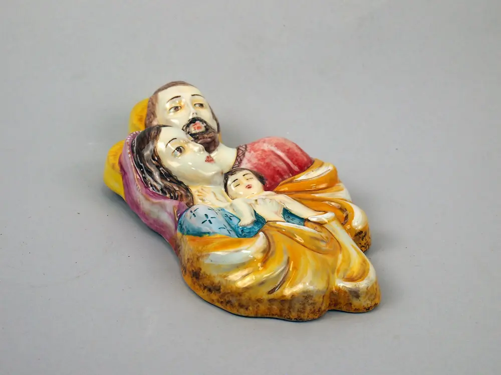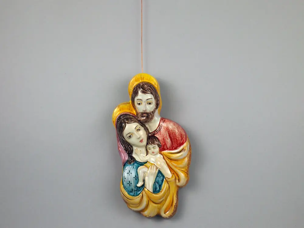 CategoryHoly Family in majolica with relief workmanship, entirely hand-painted. The composition depicts Mary, Joseph and Baby Jesus in an embrace that outlines the unity of the family nucleus.