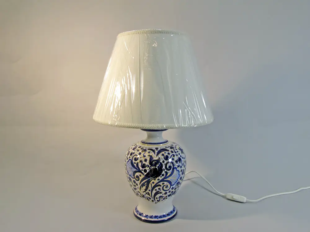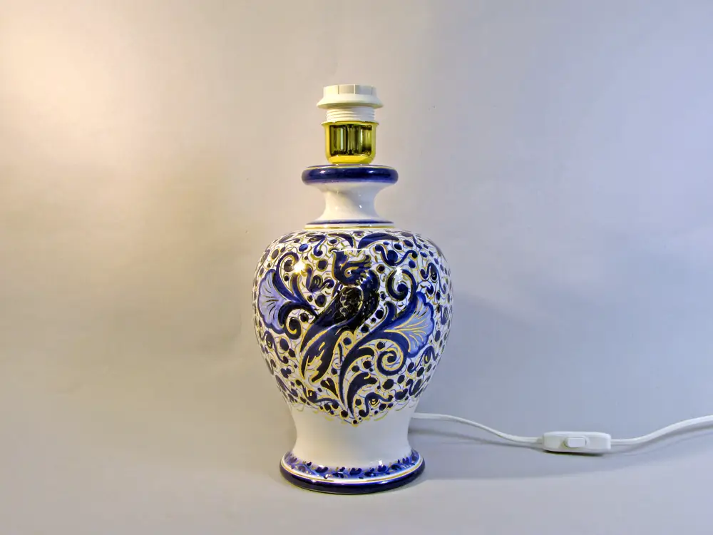 CategoryHand-painted Italian ceramic table lamp with Melograno (Pomegranate) decoration. The Melograno is a Faenza decoration dating back to the early twentieth century characterized by decorative motifs from the Mediterranean tradition, Art Deco elements and brush strokes of pure gold. The lampshade is handcrafted in white fabric and is plasticized inside to facilitate cleaning. Dimensions of the Melograno table lamp: