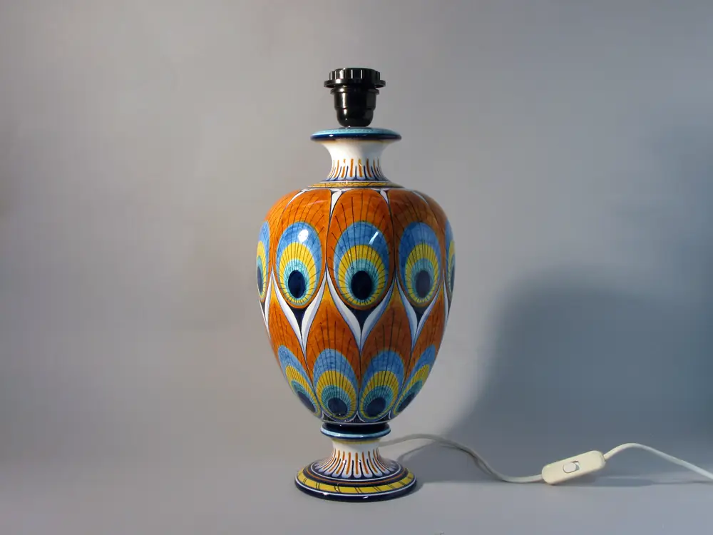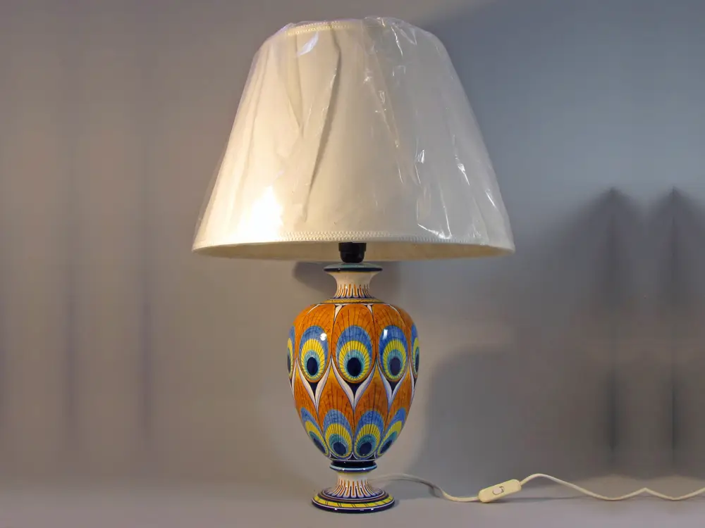 CategoryFaenza ceramic table lamp with white fabric lampshade. The ceramic is hand-decorated in Pavona style, one of the classic decorations of Faenza majolica. The predominant color is orange, the shades of yellow and blue “simulate” the eye of the peacock feather.