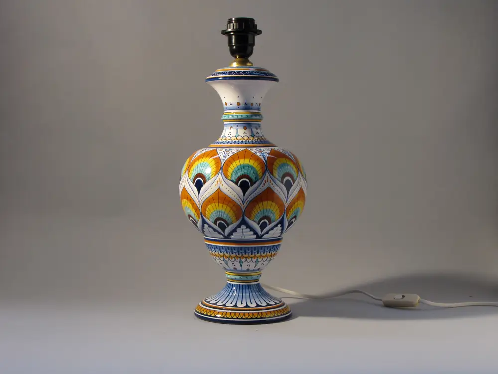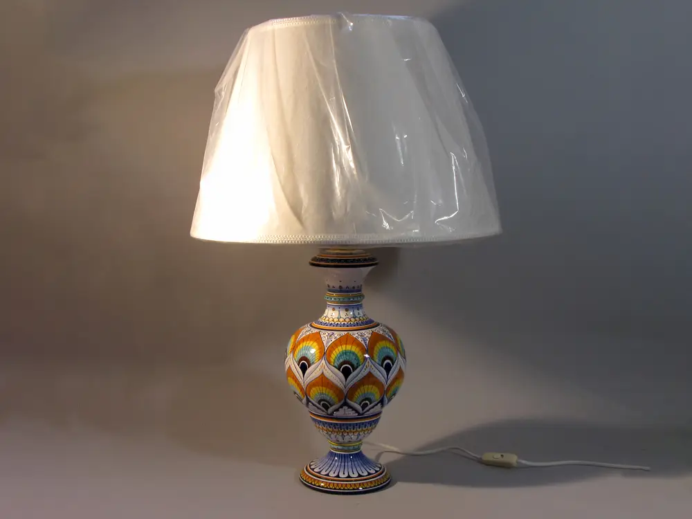 CategoryHand-decorated Faenza ceramic table lamp in Pavona style. The Pavona is one of the classic decorations of Faenza ceramics and recalls, according to Eastern tradition, the rising sun, while for Christians it is a symbol of resurrection. The hat was made in Faenza and is made of white fabric plasticized on the inside for easy cleaning. Dimensions of the Pavona table lamp: