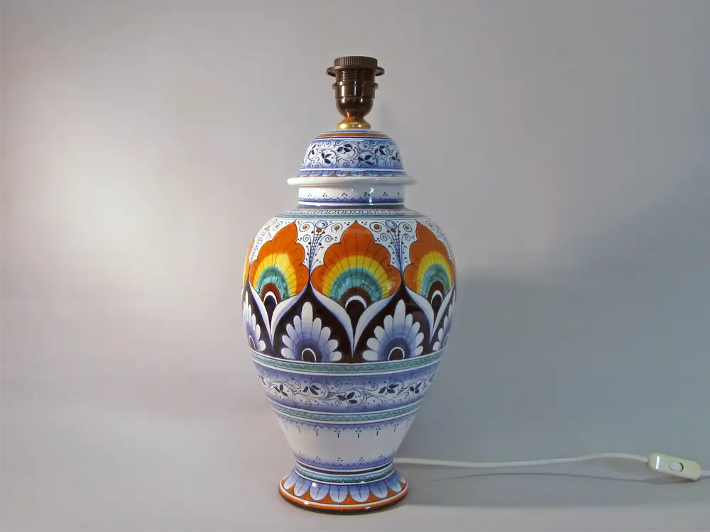 CategoryHand-painted Faenza ceramic table lamp with Peacock Feather Eye decoration, according to the Faenza majolica tradition.