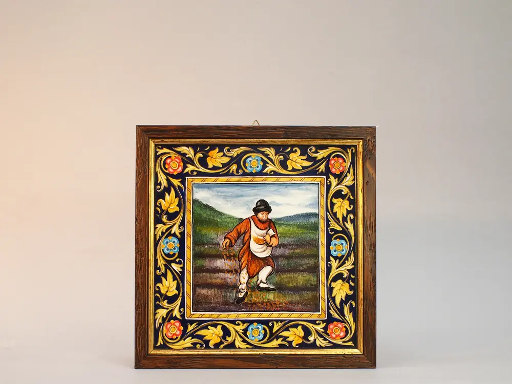 Inspired by Pietro de’ Crescenzi’s Calendar of Agriculture, so depicted in a 15th-century illuminated codex of his famous Ruralium Commodorum libri XII (Treatise on Agriculture) of 1304, it represents the month of September, when sowing took place: the seeds remained “dormant” all winter, ready to sprout with the first sun of spring.
