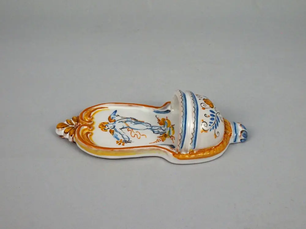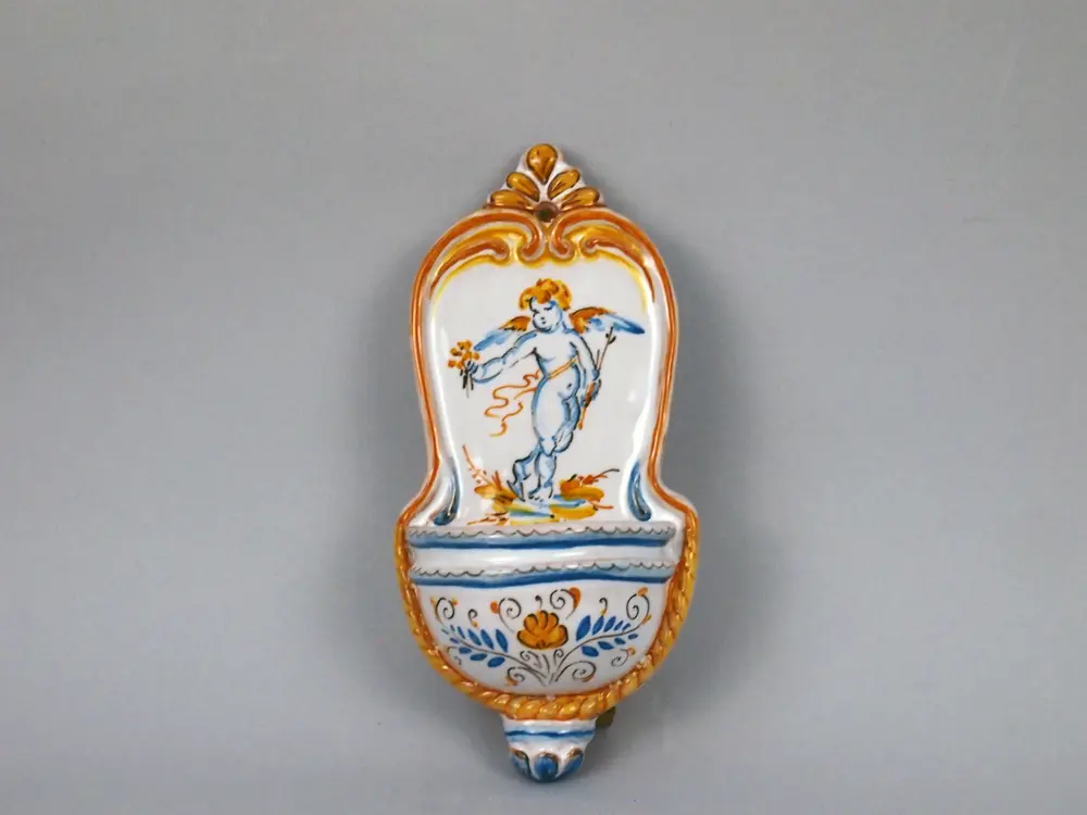 CategoriaAcquasantiera in ceramica di Faenza dipinta a mano con decoro Compendiario e la figura di un Putto.