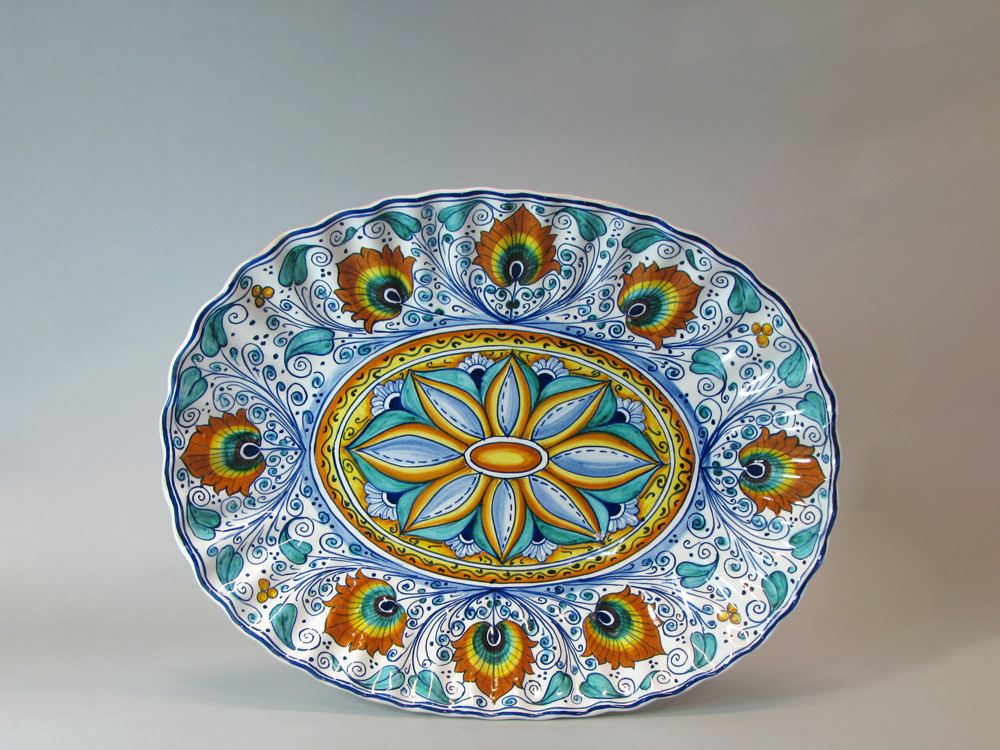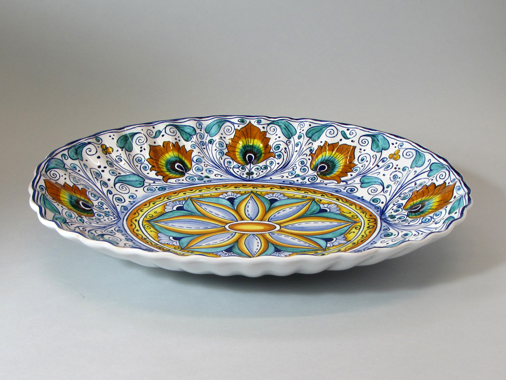 CategoriaCiotola ovale, detta crespina per la forma ondulata, dipinta a pavoncelle e rameggi con foglie verde-azzurro; al centro un fiore geometrico tradizionale.